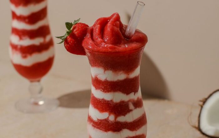 Spoon the daiquiri into the base of two short glasses or small cocktail glasses. Top with a spoonful or two of whipped vanilla cream and repeat this process, layering the two until both glasses are full. Garnish each glass with a fresh British strawberry and enjoy right away.